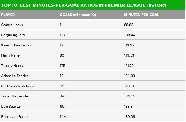 毫无以外地,热苏斯的曼城队友阿圭罗在这份榜单中排名第二,他每打进一球的时间要比热苏斯多20分钟,但他的127粒进球要比热苏斯多得多。还有两名英超进球超过100粒的球员出现在了这份榜单上,分别是阿森纳传奇射手亨利(175球,121.79分钟/球)和罗宾-范佩西(144球,139.69分钟/球),热刺前锋哈里-凯恩(80球,119.53分钟/球)也将在未来迈入百球俱乐部。