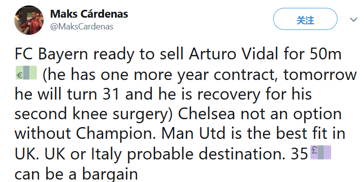 值得一提的是,Maks Cárdenas在报道智利球员以及教练方面的消息具备一定的权威性,今年冬窗他率先报道过桑切斯可能加盟曼联的新闻,而夏窗他也披露了佩莱格里尼执教西汉姆联的新闻。
