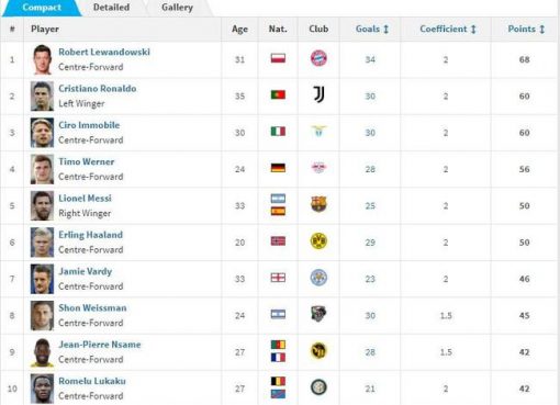 欧洲金靴排名:C罗强势追击 莱万霸主地位保不住了